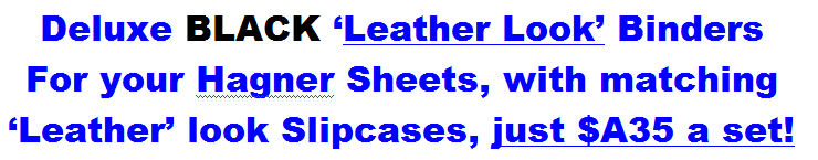 COMBINE Hagner sheets AND Deluxe Binders/Slipcases to house them all in, and SAVE another $A100! Order 200 genuine and top quality British Made Hagner sheets, in the exact size mix YOU require, as well as FIVE of the superb black binders/slipcases above, that will house them perfectly, and safely, and you save about 50% off retail price! Instead of paying $A290 and $A215 - you pay only $A485 plus shipping, and save $A20 extra. (Stock 827WP) And remember the shipping is nearly (indeed often exactly the same) the same cost for the Hagners, if you add the 5 x Slipcases/Binders to the same order in the same carton. Order 400 Hagners of your choice or sizes (normally $A495) and TEN x Deluxe Binders/Slipcase to house them in (normally $400) together for $A895 and save a further $A40! (Stock 827WQ) (Due to weight and volume, these are shipped as two parcels.) Order 600 Hagners of your choice or sizes (normally discounted to $A715) and TWENTY x Deluxe Binders/Slipcase to house them in (normally discounted to $A700) together for $A1,315 and save a further $A100! (Stock 827WR) Due to weight and volume these are shipped as three parcels.) |